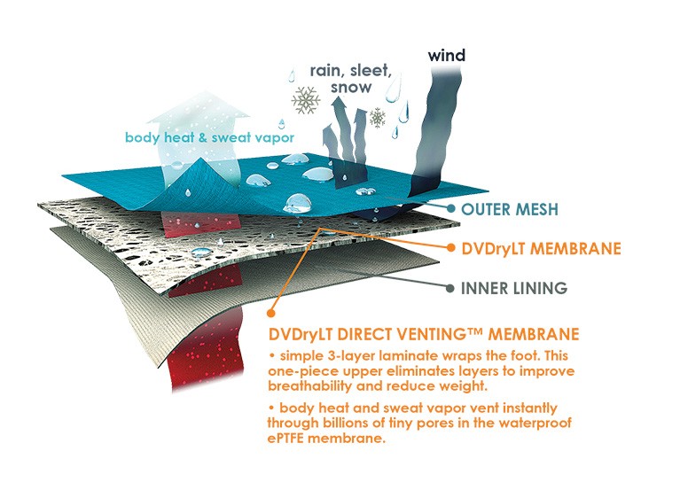 The original air permeable waterproof footwear technology. From the trailhead to base camp, DVdry footwear answers the call when all-weather protection is needed. Their proprietary Direct Venting (DV) technology utilizes billions of microscopic pores to instantly vent the water vapor (sweat) inside your footwear when you’re active. Constructed using bootie or gasket manufacturing techniques, DVdry technology is ideal for rugged, punishing environments.
